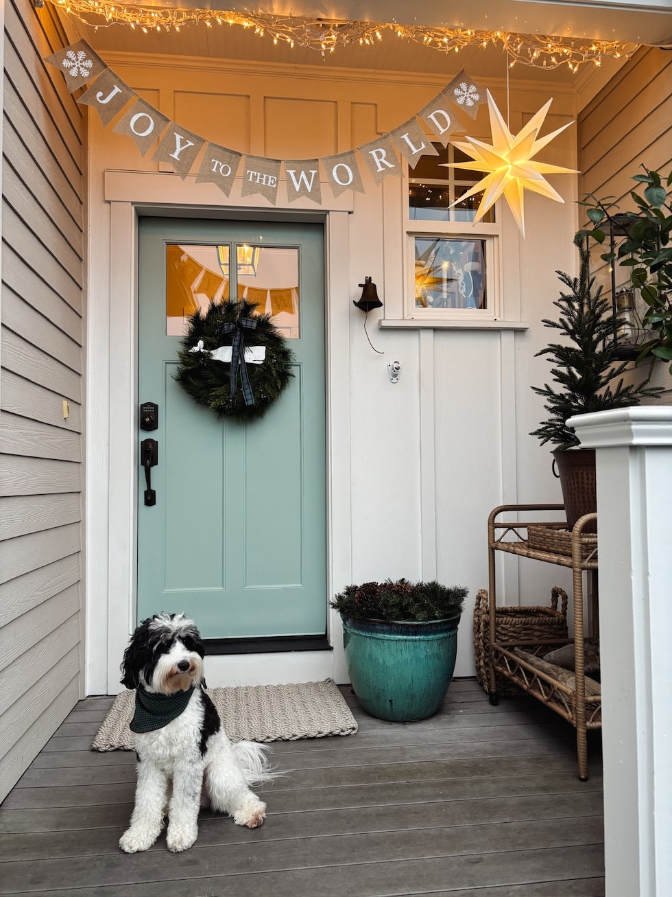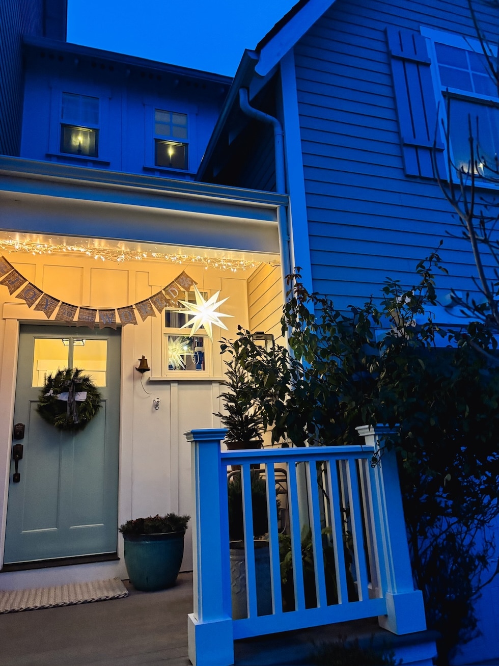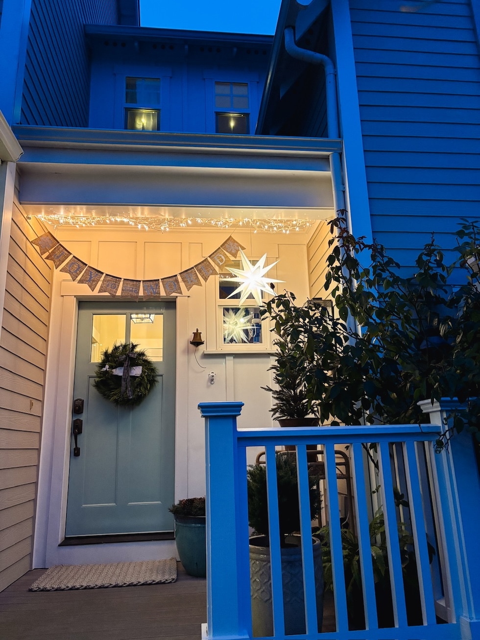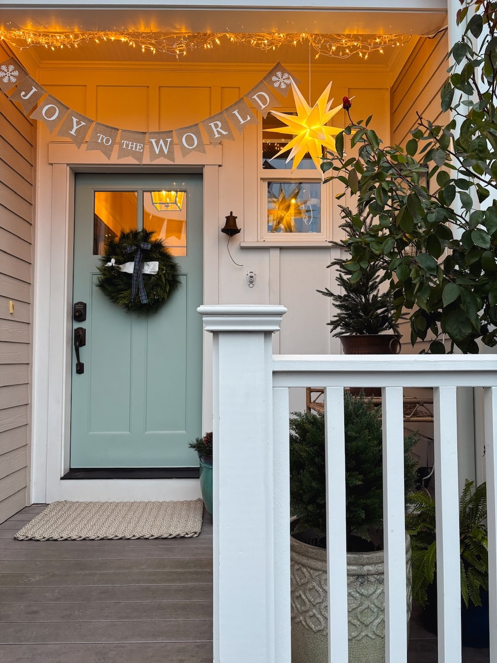 We also hung a Christmas banner, lights, and our stars so it feels festive! I’ve decided that banners for over our front door are a fun seasonal tradition. They are charming, simple to hang, really easy to store (big plus in a smaller home!) and add a sense of celebration for each season. I forgot last month to take a photo of our Give Thanks Thanksgiving banner, and you’ve seen our Trick or Treat one! We will probably get one for spring and summer, too. We don’t have to keep banners up all year, but we can bring them out for a new season, holiday or family celebration.