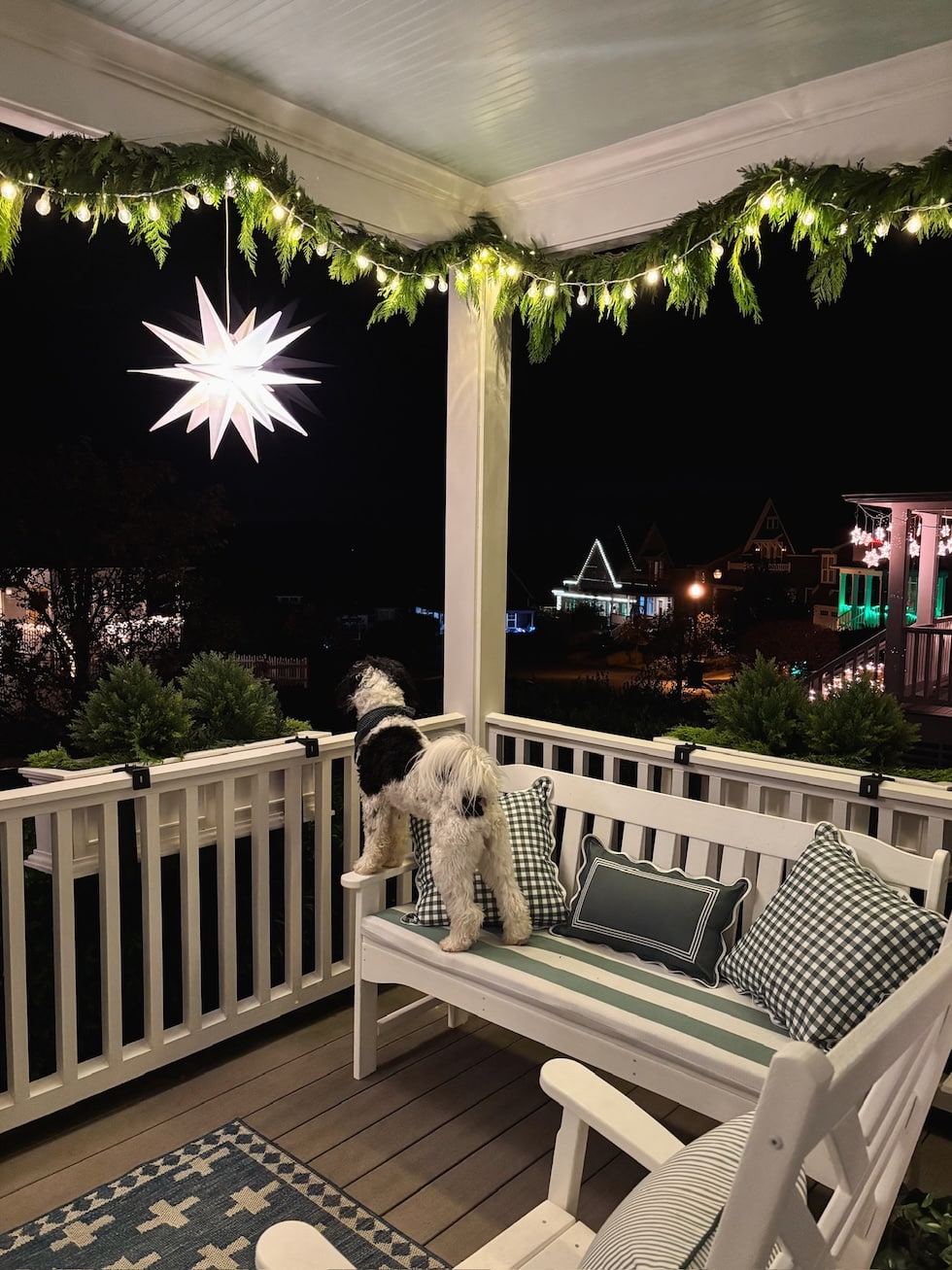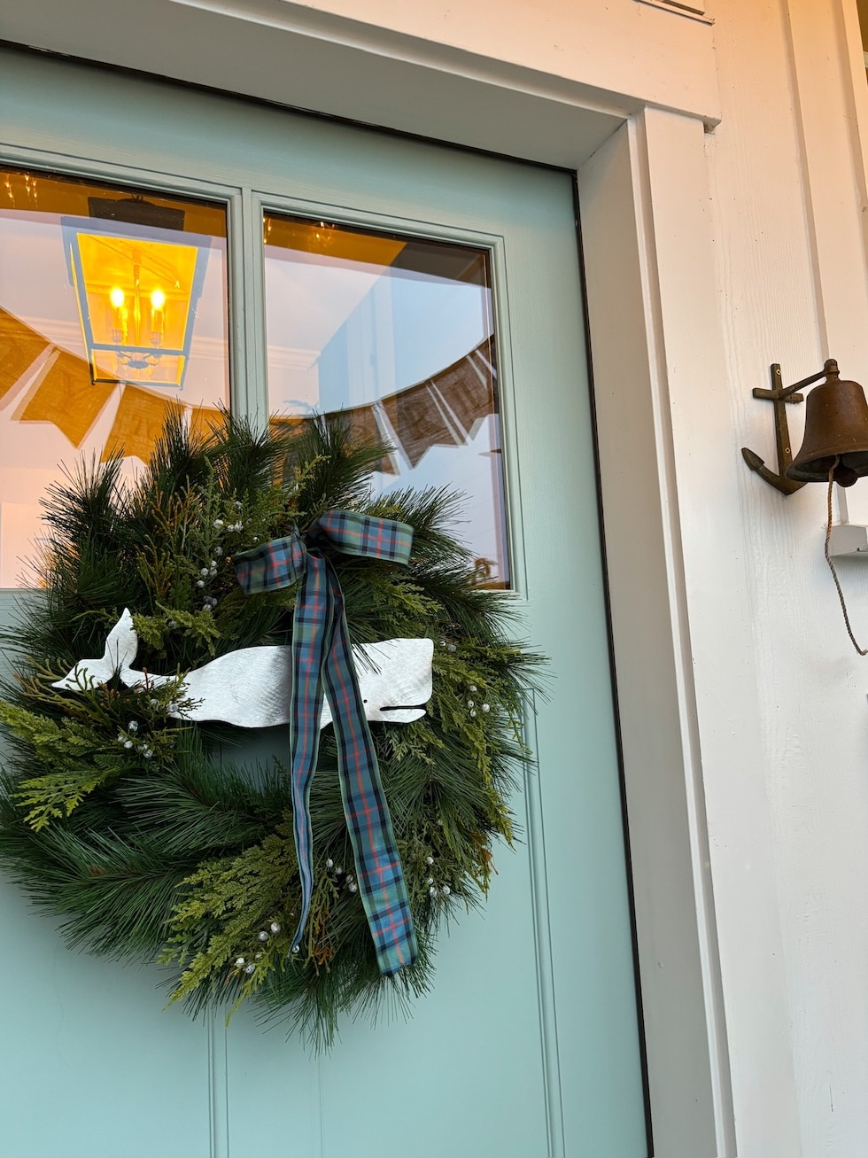 Right after I hung the wreath and went inside I had an idea, what If I tucked the ribbon behind the whale? Now he’s even more the star of the porch!