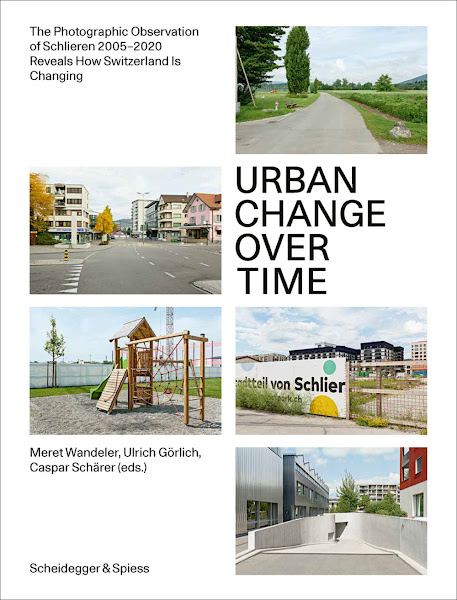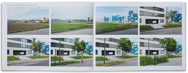 The first of the two volumes, which are packaged in a sleeve bearing the cover shown above, is a 152-page landscape-format book with spreads devoted to the 69 locations in town that were documented in photographs over the fifteen years, typically every two, odd-numbered years (some gaps are found in some places). The consistency of the photographic framing is exceptional, owing in part to the hiring of professional photographers after the initial photos were taken by the authors. The locations are keyed to maps in the back of the book, one for 2005 and one for 2020; seen together, the photographs and map illustrate the districts where STEK I was focused, where change was most pronounced. The town is basically bisected by the east-west rail line that connects it to Zurich; the most apparent change and increased density is visible to the north, while areas close to the train tracks on the south side were also filled in. Given the broad swath of the town documented by the project, it’s interesting to see places where change is not immediately evident, akin to a real-life version of those find-the-differences cartoons.